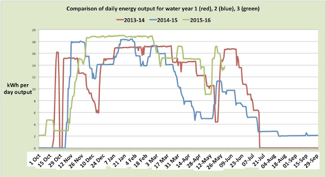 The stimulus behind all these efforts is to squeeze as many kWh's out of this 'low flow' time of year as I can, - all in the hope I'll hit my 4 MWh total for the year!