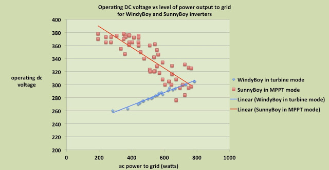 This was a startling difference and the plot below shows it. As can be seen, with diminishing power the SunnyBoy's operating voltage progressively rises, whilst the WindyBoy's progressively falls.